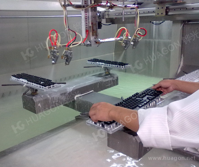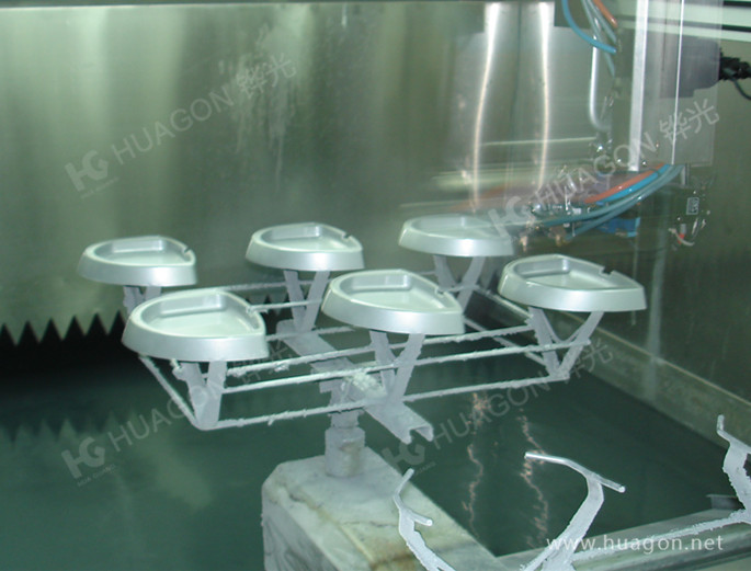 上料-手動(dòng)靜電除塵-素材預(yù)熱-手工放料-自動(dòng)噴涂-靜置-隧道式烘烤-冷卻-下料